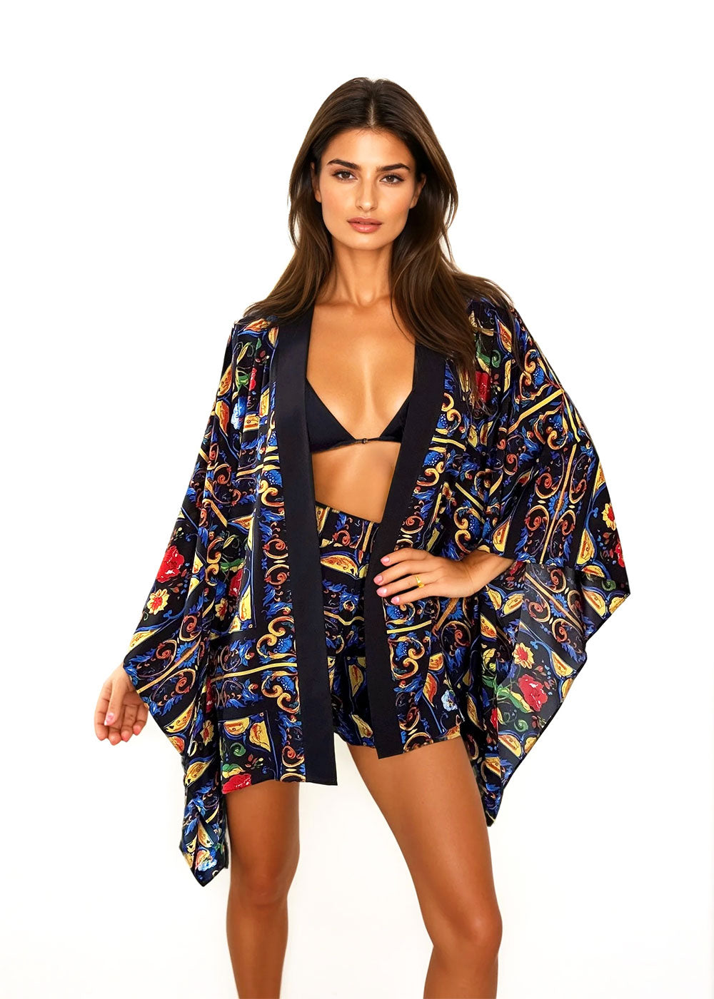 Kimono - print from vibrant Siciliana collection inspired by colorful Italian majolica, with black finish.